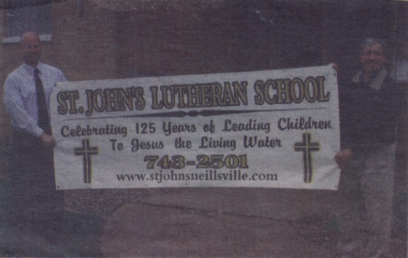 St. John’s Lutheran School Principal and sixth-through eight-grade teacher Bill Tomlin (left) and St. John’s Evangelical Lutheran Church pastor Tim Biebert display a banner Tuesday, May 10, celebrating the 125th Anniversary of both the school and church. A celebration will be held at the church Sunday May 22, 2011.