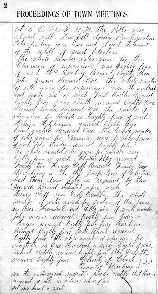 he first annual town meeting of the town of Reseburg was held in the school house at Zimmer's corners and opend the polls at 9 O'clock a.m. on April 3rd 1894 on motions made and carraid the fowlling officers were duley elected as officers for said election