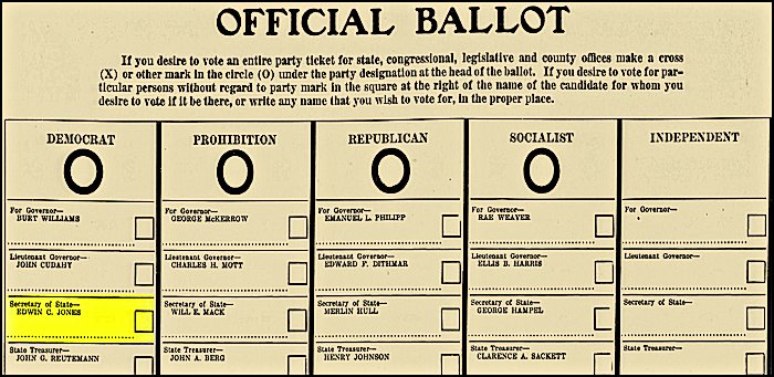 Snippet of the 1916 Official Ballot 27 Oct 1916--Showing Edwin C. Jones running for Sec. of State.