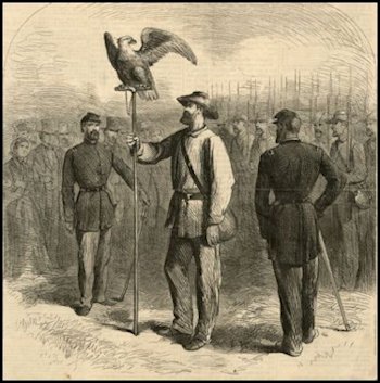 The 8th WI Co C. Eagle Regiment unit is known as one of the five organizations in the country permitted to have in its possession a bald eagle. This particular stuffed bird is on long-term loan to the unit from the Department of Natural Resources and federal government and is often used during their re-enactments, both as a standing symbol of patriotism and because the original Old Abe unit actually ha a bald eagle as its mascot.