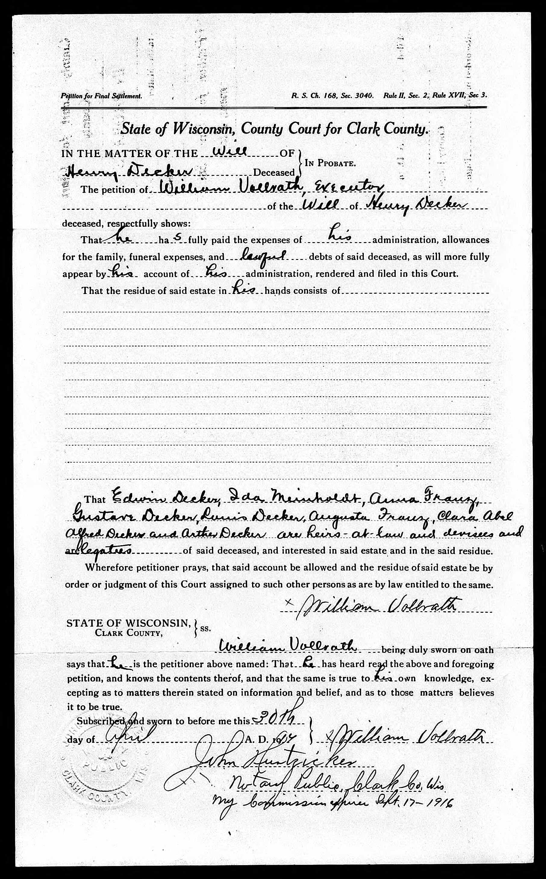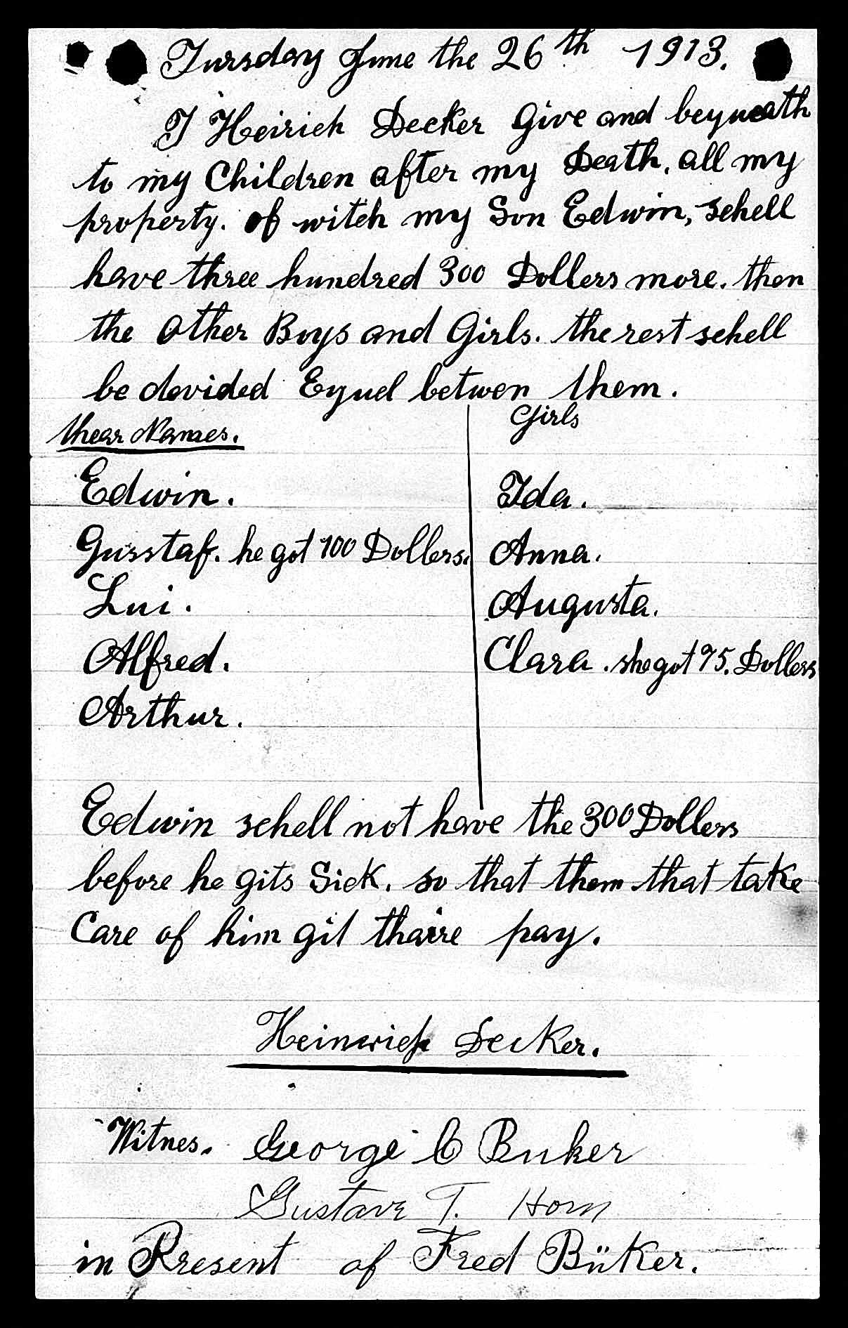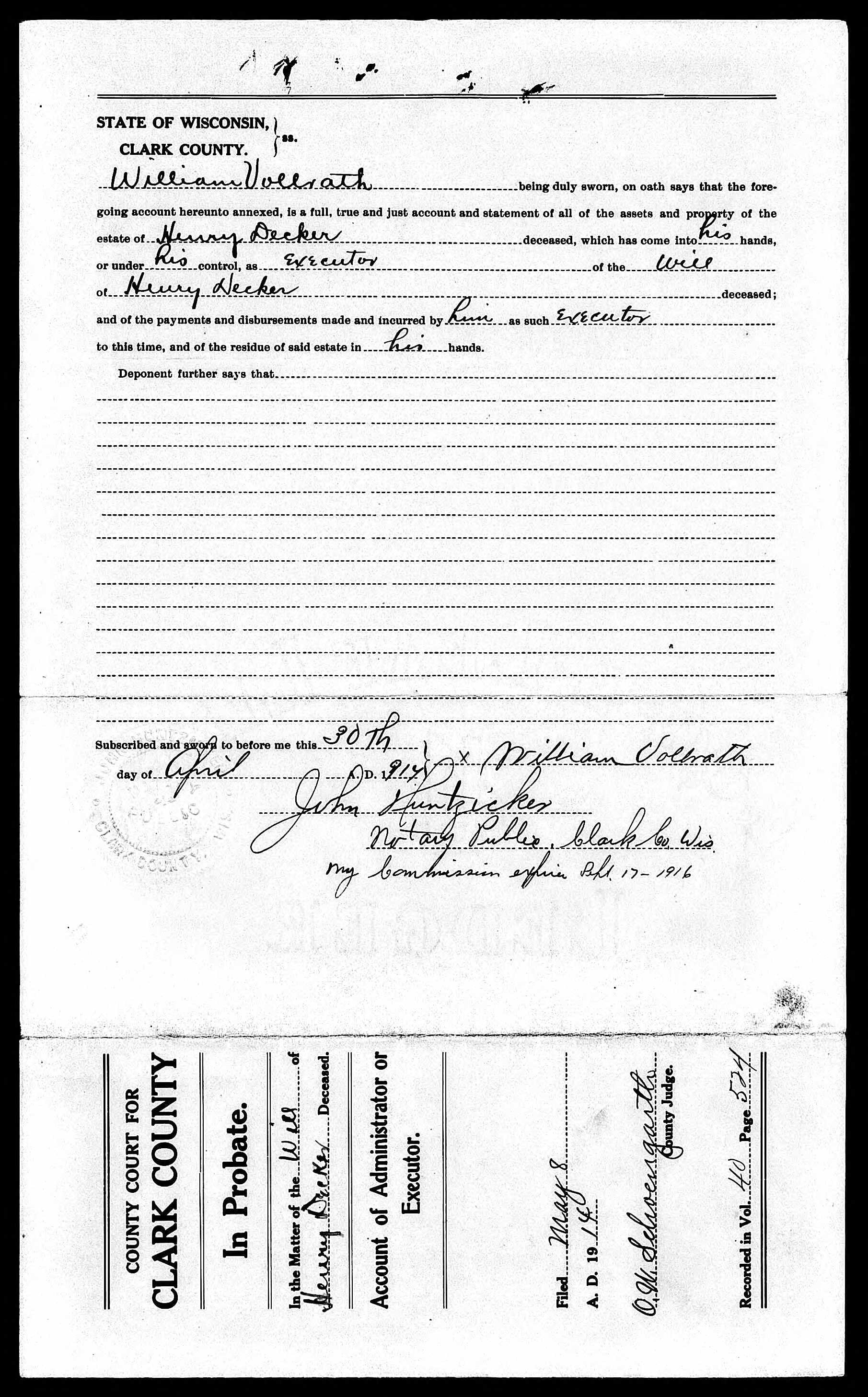 Henry Decker Estate Documents from 1913