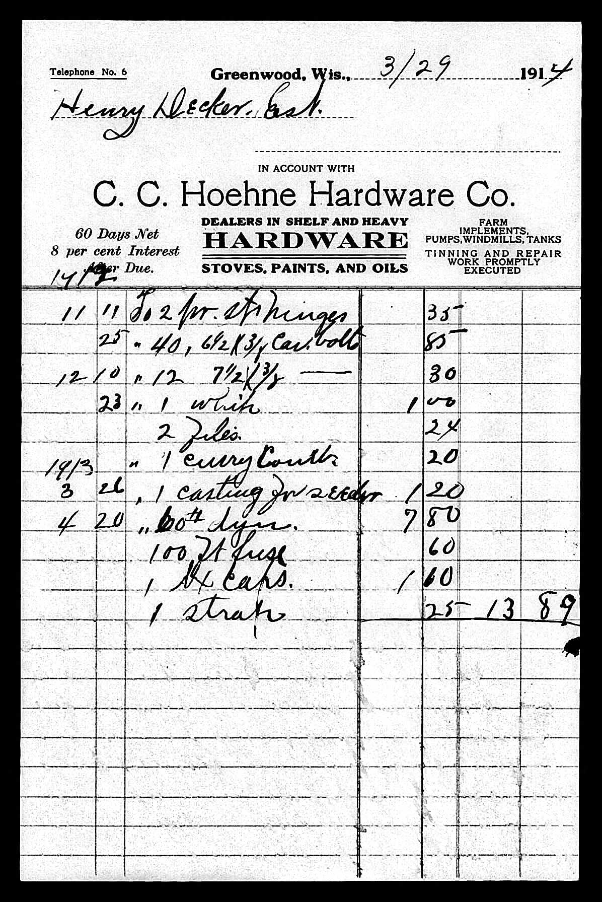 The bill from C. C. Hoehne Hardware Co. was filed as part of Henry Decker's Estate in 1913. C. C. Hoehne's was located on the north end of Main Street in Greenwood, Wisconsin. Even in the 1960's, if you needed something special, Hoehne's probably had it somewhere in their store.